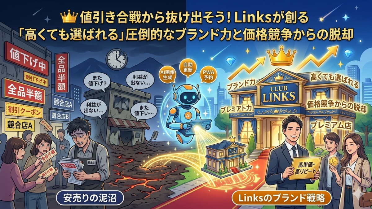 今回は、AI一括管理システム**「Links(リンクス)」が、いかにしてお店を「安売りの沼」から救い出し、エリアで一目置かれる「プレミアムな人気店」**へと押し上げるのかをお話しします!🚀✨