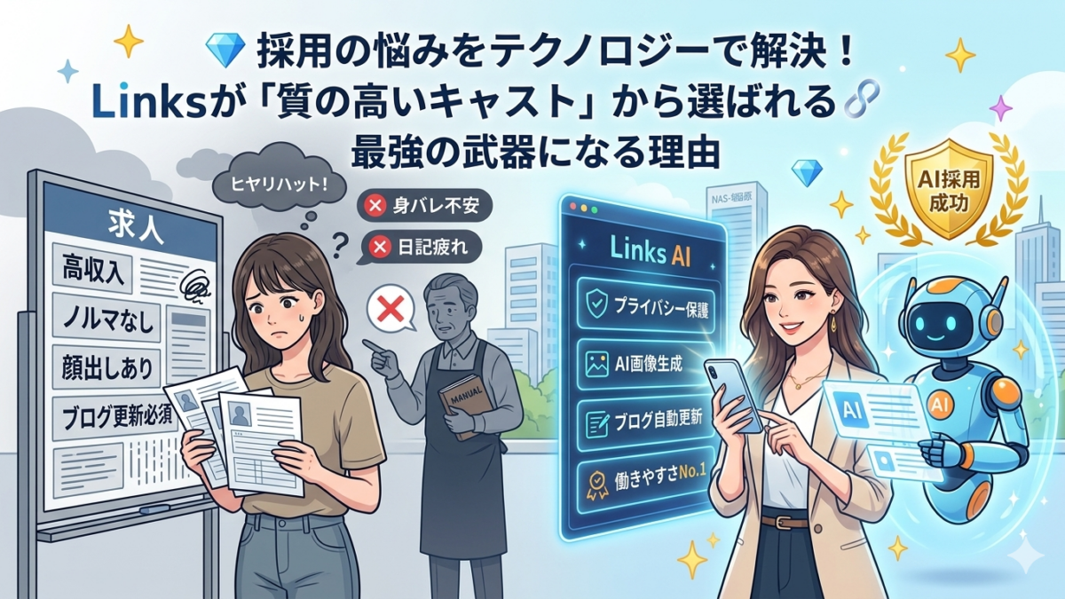 Linksなら、AIが本人に代わって「売れる日記」を自動生成! 「うちのお店は、日記の更新作業は一切不要です。接客だけに集中してください」。 求人募集にこの一言を添えるだけで、応募率は劇的に変わります。キャストさんの自由時間を尊重する姿勢こそが、今の時代に選ばれる条件です。📈💖